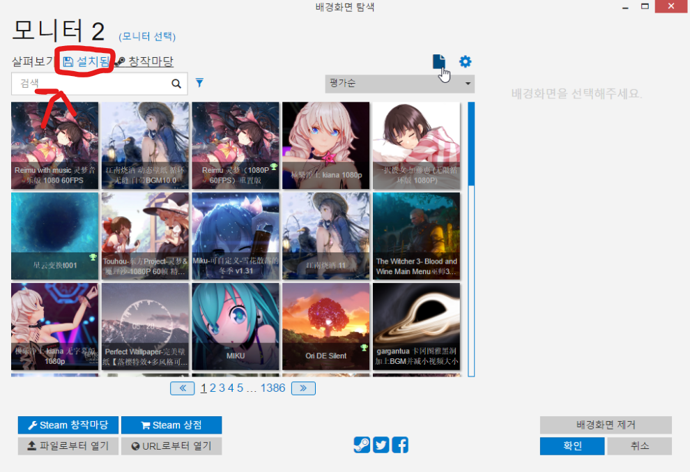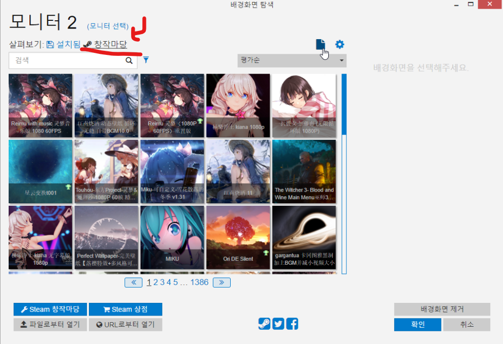 설정을 끝내시고 wallpaper Engine 안에 들어가시면 창작마당에 들어가셔서 그림이나, 사진 등을 검색란에 입력하여 원하는 이미지를 다운하시면 됩니다.