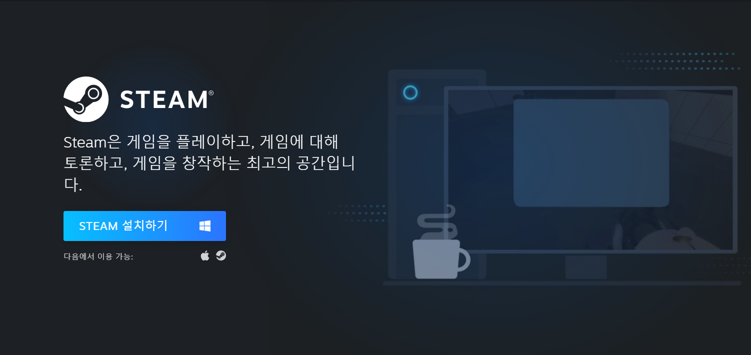 Steam 설치 버튼을 클릭하면 다음과 같은 창이 뜹니다. 여기서 중앙에 파란 박스로 되어있는 STEAM 설치하기 버튼을 클릭해주시면 됩니다.