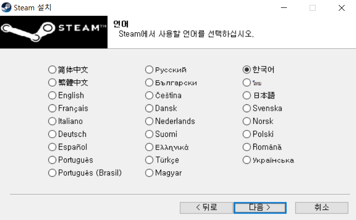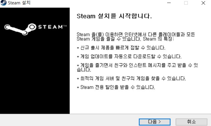 다운로드가 완료되고 프로그램을 실행했으면, 다음과 같은 창이 뜹니다. 스팀의 설치를 위해 다음> 버튼을 클릭해주시면 됩니다.
