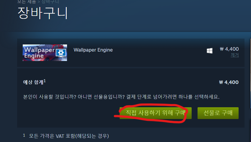 Add to Cart 버튼을 클릭하면, 위처럼 장바구니 창으로 이동됩니다. 이 창에서 월페이퍼 엔진을 설치하기 위해 '직접 사용하기 위해 구매'를 눌러주시면 됩니다.