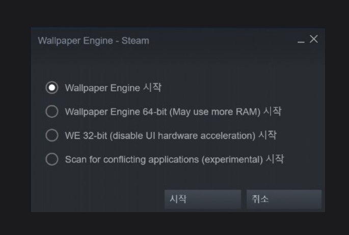 구매를 완료하셨으면, 실행버튼을 클릭해 wallpaper Engine를 실행시키시면 됩니다. 다음으로 아래 같은 화면이 나오실텐데 아래 보이는 것처럼 기본을 클릭하시면 되고, 32bit, 64bit도 설정이 가능합니다.