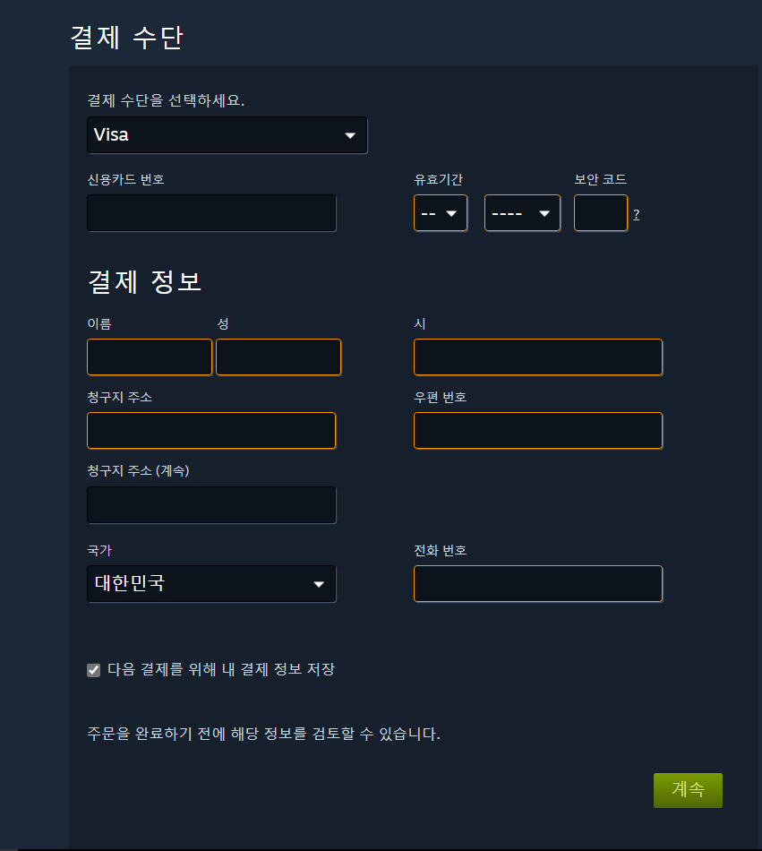 그러면 결제 수단, 결제 정보를 입력할 수 있는 창이 나옵니다. 여기서 구매를 위해 카드 번호 등과 자신의 이름, 생년월일, 주소 등을 입력하신 후, 계속 버튼을 클릭하시면 됩니다.