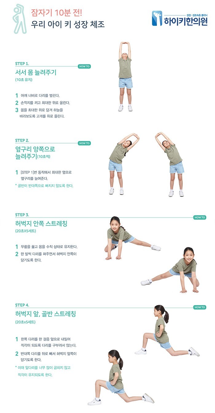 첫 번째로는 스트레칭입니다. 스트레칭은 성장기에 성장판을 자극하고 몸에 긍정적인 영향을 주어 성장호르몬을 많이 만들수 있게 하게 때문에 성장기에 꼭 필요한 운동이라고 할 수 있습니다. 또 스트레칭은 유연한 사람들이 잘하는 인식이 있는데요, 스트레칭은 누구나 할 수 있는 운동이기 때문에 힘이 들지 않고도 쉽게 따라하실 수 있습니다.